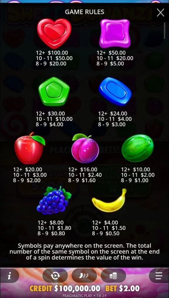Sweet Bonanza is a 6×5 grid slot game that introduces a refreshing twist to traditional slot mechanics. Instead of using paylines, it employs the Cluster Pays system. This means players win by landing at least 8 identical symbols anywhere on the grid, regardless of their position. After a winning combination is formed, the cascading mechanic kicks in, removing the winning symbols and replacing them with new ones, creating a chain reaction of potential wins.