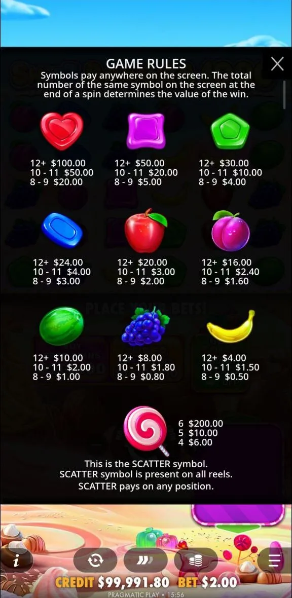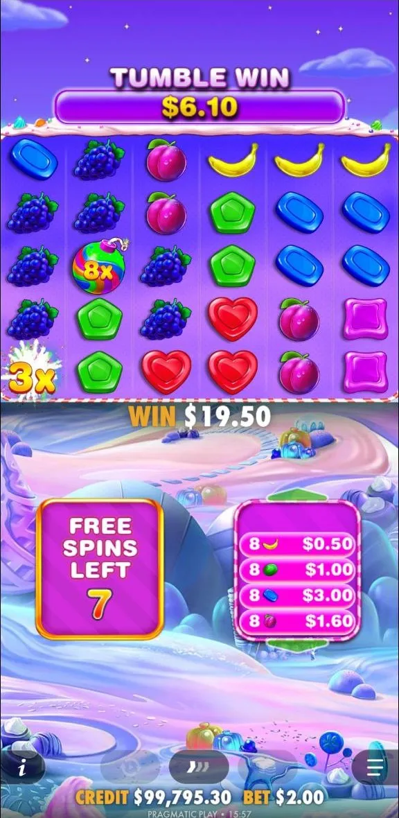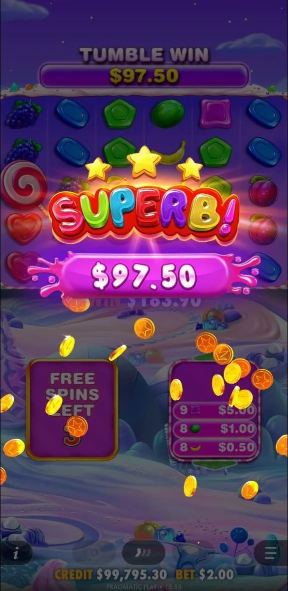 The game’s visuals are colorful and engaging, with classic fruit and candy symbols reminiscent of the original Sweet Bonanza game. The game offers a maximum win of 25,000x the bet. It features a 6×5 grid and a “scatter pays” system where matching symbols of 8 or more anywhere on the grid result in a win, with winning symbols cascading to make way for new ones. Players can trigger 10 free spins by landing four or more lollipop scatters, with the possibility of retriggering additional spins. A unique feature of the game is the candy-bomb multipliers that can appear during free spins, which can reach up to 1,000x and significantly boost total winnings.